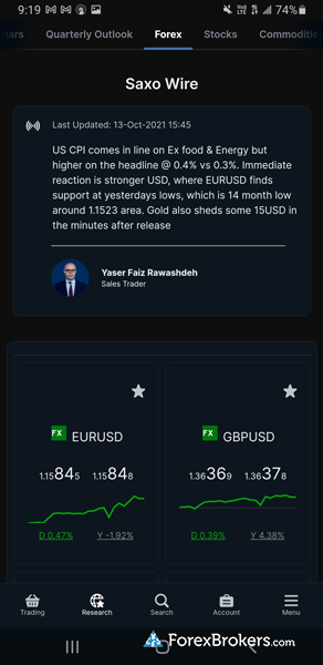 Quality research, and integrated trading signals: One of the main reasons Saxo is among my top choices for CFD trading has to do with the quality of its research across such a wide range of tradable CFDs, and integrated trading signals within its platform suite. Saxo’s high quality research and integrated trading signals can make it more efficient to find and act on trading opportunities and to analyze news events in relation to market price movements.