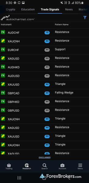 It’s worth noting that IG also offers the popular MetaTrader 4 platform, though it doesn’t support as many CFDs as its other platforms. Integrated trading signals from PIA First and Autochartist are also available at IG, as well as analysis from third-party provider TipRanks.