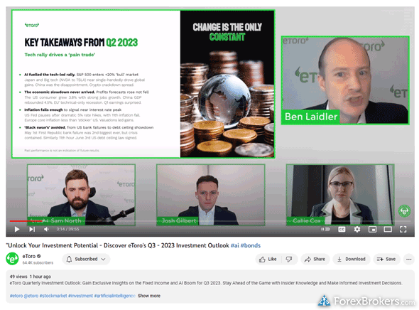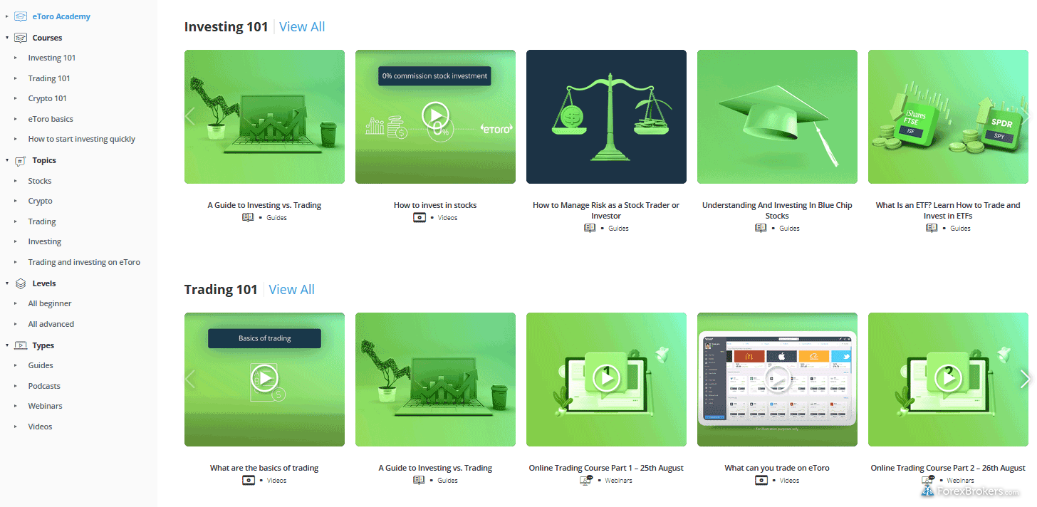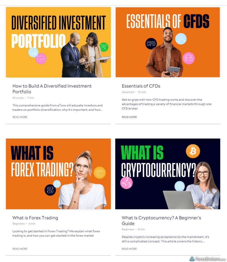 For beginners looking to dive into the world of forex and CFDs, both eToro and Plus500 provide a wealth of educational resources to help new traders learn the ropes. eToro prides itself on offering a diverse selection of educational content, including over 10 targeted pieces such as articles, videos, and webinars that focus on forex and CFDs. They also host monthly webinars and maintain a searchable archive for users to revisit previous sessions. eToro further enhances learning with a comprehensive set of beginner videos and an investor dictionary, defining over 50 investing terms, making it a user-friendly choice for novice traders. This wealth of resources contributes to eToro's high educational rating of 4.5 stars and a commendable ranking of #5 out of 63 brokers by ForexBrokers.com.
