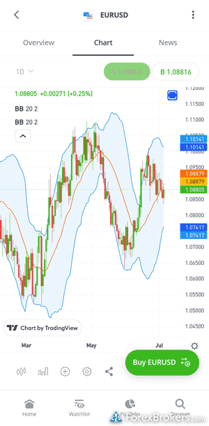 For traders seeking mobile app solutions, both eToro and Plus500 offer impressive options for iPhone and Android users. Each app gives access to stock or forex price alerts, watchlist symbol syncing, and the ability to create watchlists with real-time quotes. eToro provides 104 technical studies for charting, while Plus500 offers a slightly higher number at 115. When it comes to interactive features, Plus500 stands out by allowing users to draw trendlines on charts, a feature not available in eToro's app. Both platforms, however, do not have the capability to auto-save chart drawings. Time frame viewing is flexible on both apps, supporting daily, weekly, and intraday analysis.
