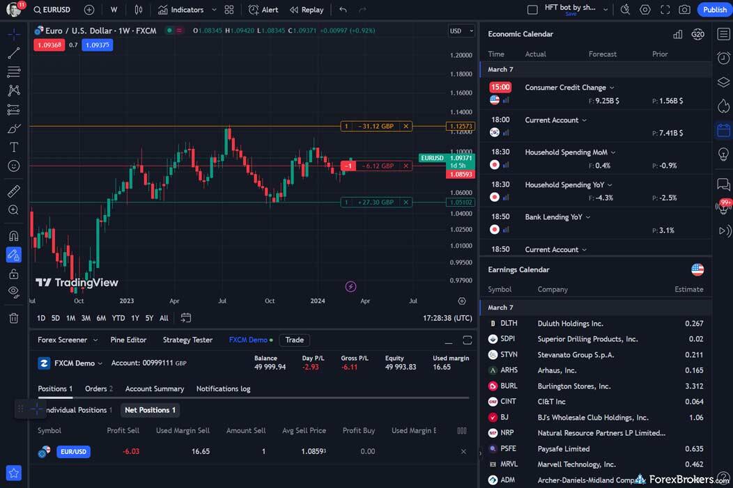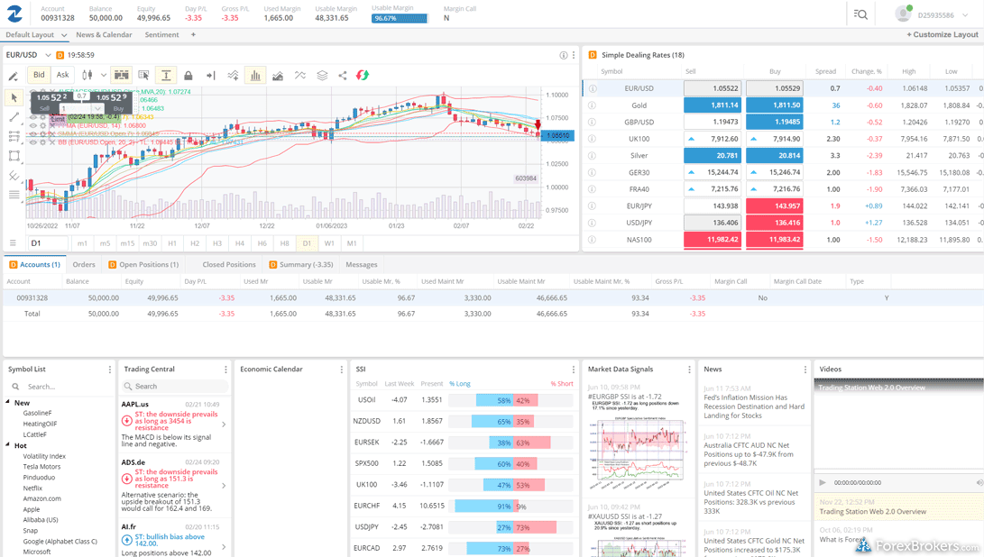 When evaluating FOREX.com and FXCM for their market research offerings, both brokers provide comprehensive daily market commentary and access to forex news from reputable sources such as Bloomberg and Reuters. Both also include Technical Analytics tools from Trading Central, along with sentiment-based trading tools that demonstrate long or short positions across currency pairs. Furthermore, each features an economic calendar that showcases current and upcoming global news events. However, a key difference lies in additional services: FXCM provides market research from TipRanks, whereas FOREX.com does not.