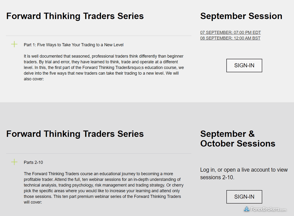 When comparing the educational resources for beginners offered by FOREX.com and OANDA, both platforms demonstrate a strong commitment to educating their users. Each broker provides more than 10 educational pieces focused on forex and CFDs, such as articles, videos, and archived webinars. They also conduct client webinars at least once a month and maintain searchable archives for past sessions. Both brokers offer a variety of videos tailored to beginners and advanced traders, covering essential trading topics. Additionally, each provides an investor dictionary featuring definitions of over 50 investing terms, helping newcomers become familiar with trading jargon.