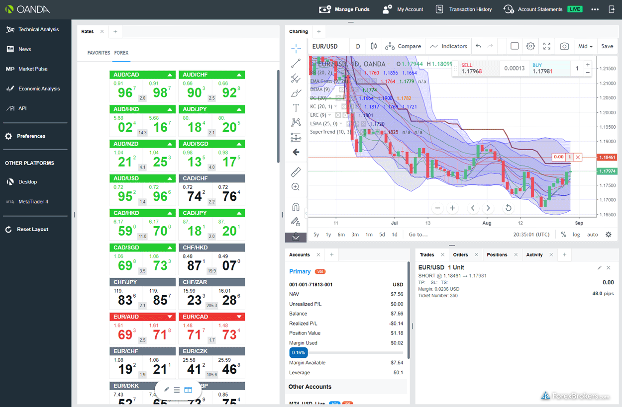 When comparing the commissions and fees of FOREX.com and OANDA, traders will find that both brokers have unique offerings but with some differences in cost-effectiveness. FOREX.com is known for its multiple account types, including the Standard and RAW accounts. While the Standard account is the only option for MetaTrader clients and comes with relatively high spreads of 1.4 pips for EUR/USD in the U.S., the RAW account provides lower spreads, averaging 0.13 pips but with added commissions. This makes FOREX.com appealing to high-volume traders, especially those who can surpass $50 million in monthly trades to benefit from discounts. This setup earns FOREX.com a commendable rating of 4.5 stars and a rank of 13th out of 63 brokers by ForexBrokers.com.