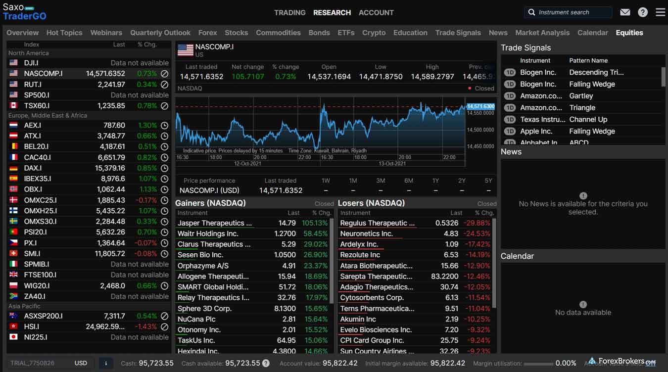 When comparing the market research offerings of Interactive Brokers and Saxo, both platforms provide a substantial array of resources. They each deliver daily market commentary and forex news from top-tier sources like Bloomberg and Reuters, ensuring users stay informed with reliable insights. However, Interactive Brokers extends its advantage with exclusive market research tools from TipRanks and Acuity Trading, which are not available through Saxo. Despite this, Saxo shines with its integration of Autochartist, a popular tool for technical analysis, whereas Interactive Brokers does not offer this feature.