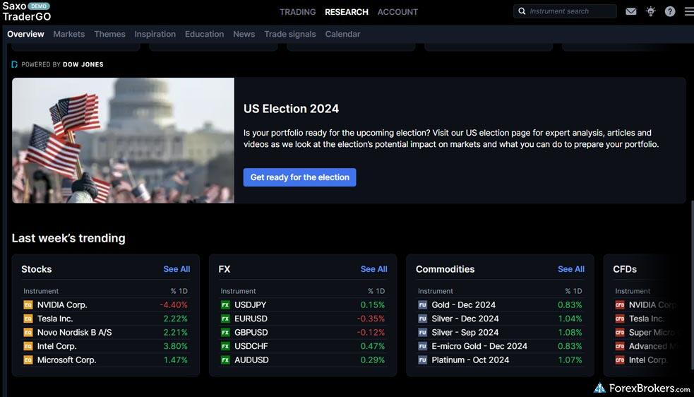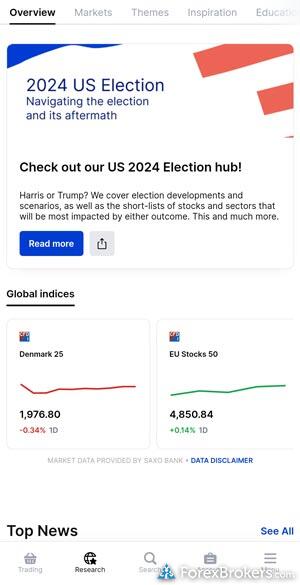 Both brokers come equipped with sentiment-based trading tools and economic calendars to track global news events. While Interactive Brokers garners an impressive five-star research rating and holds the third position among 63 brokers for research, Saxo achieves not only a five-star rating as well but is also ranked as the top provider in this category. This suggests that although Interactive Brokers provides diverse research tools, Saxo's research is considered unparalleled by ForexBrokers.com, highlighting its superior overall research offering.